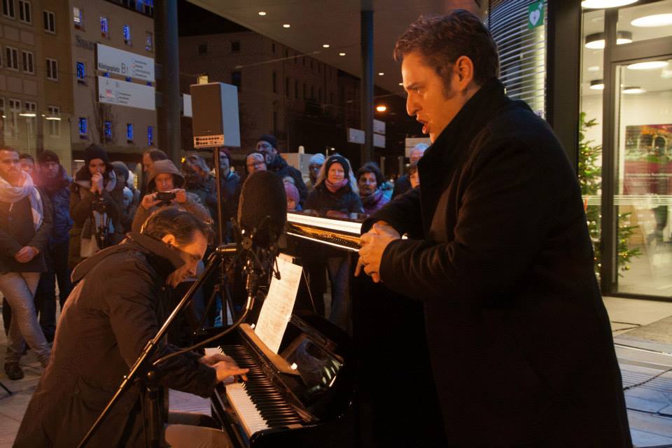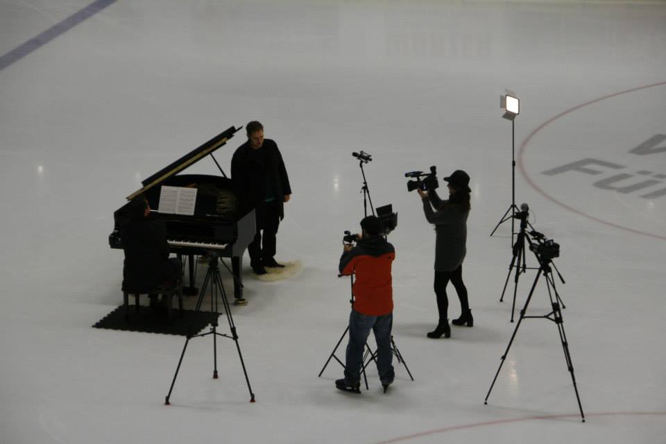 Hoffentlich bringen Sänger und Pianist an diesem Abend das Eis nicht zum schmelzen, denn sie stehen auf der Eisfläche des Curt-Frenzel Stadions und wir möchten den Gastgebern des Abends (die Augsburger Panther und der Sportreferent Herr Wurm) nur metaphysischen Schmerz bescheren. Nach dem Lied eröffnet der internationale Eiskunstläufer MICHAEL ZENKNER mit einer Choreographie die Eisfläche für den gemeinsamen Publikumslauf: Zu Pianoklängen von MARTIN SEEGER können wir unsere Runden um das Klavier ziehen.