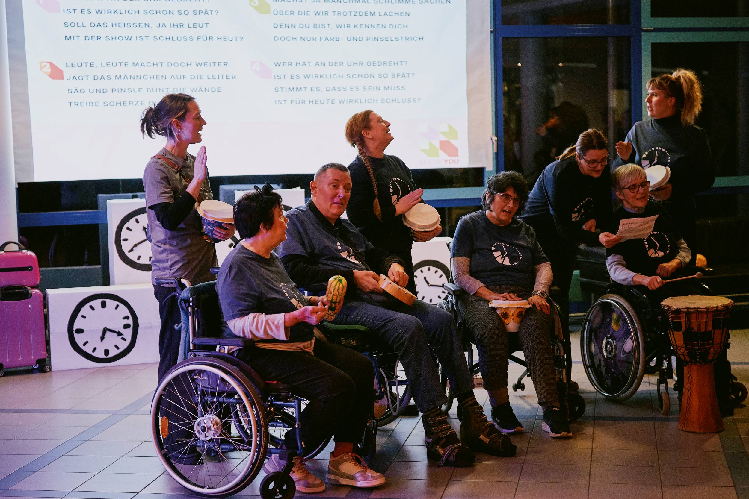 Im Rahmen des Projekts YOU-SHOW-YOU war unser oberstes Ziel, die Bewohner*innen als Künstler*innen zu sehen und sie in alle künstlerischen Prozesse sämtlicher Gewerke des Theatermachens – Schauspiel, Text, Musik, Kostüm, Bühnenbild, Medien etc. – einzubeziehen. Alle gestalteten mit uns den Stückentwicklungsprozess und trafen künstlerische Entscheidungen.